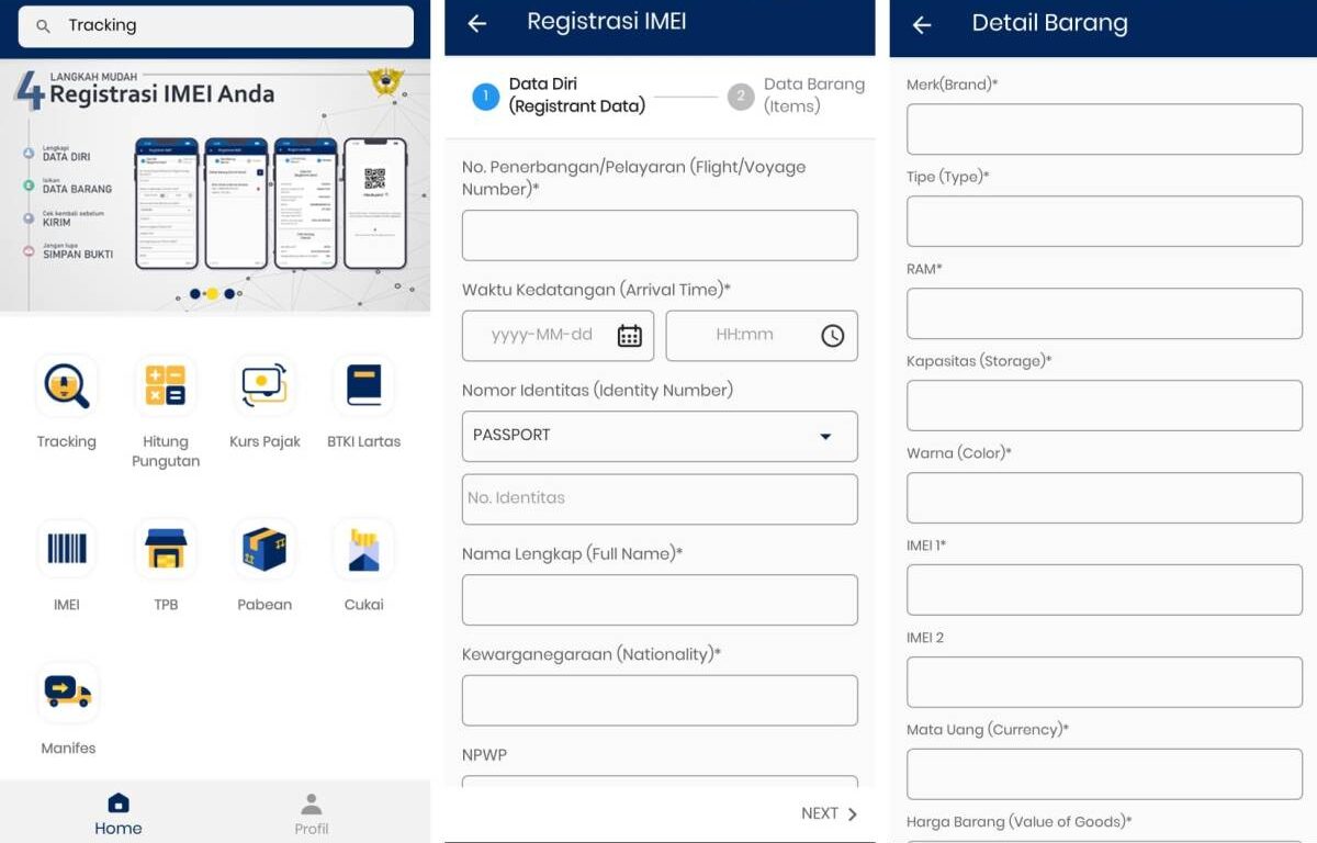 Pertama kali Penumpang atau awak sarana pengangkut membuka formulir pendaftaran IMEI pada web Bea Cukai atau aplikasi Mobile Bea Cukai, penumpang dan awak sarana pengangkut harus mengisi Data Diri yang terdiri atas: